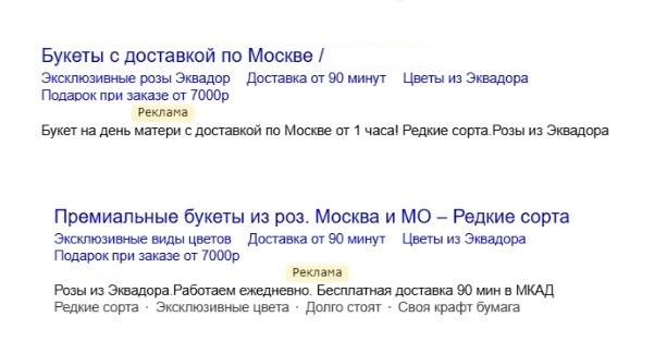 - Поисковые кампании на коммерческие запросы («заказать цветы», «доставка букетов») РСЯ с разными креативами и форматами объявлений